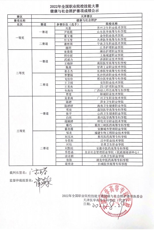本次賽項于2022年8月26-28日在天津醫(yī)學高等??茖W校舉行,吸引了來自全國28個省、自治區(qū)、直轄市的60個院校、60支代表隊的選手和指導老師參賽。全國職業(yè)院校技能大賽高職組健康與社會照護賽項共分為兩個賽道,每個賽道設個人一、二、三等獎,獲獎比例分別為 10%、20%、30%,獲得一等獎參賽選手的指導教師將由大賽組委會頒發(fā)優(yōu)秀指導教師證書。